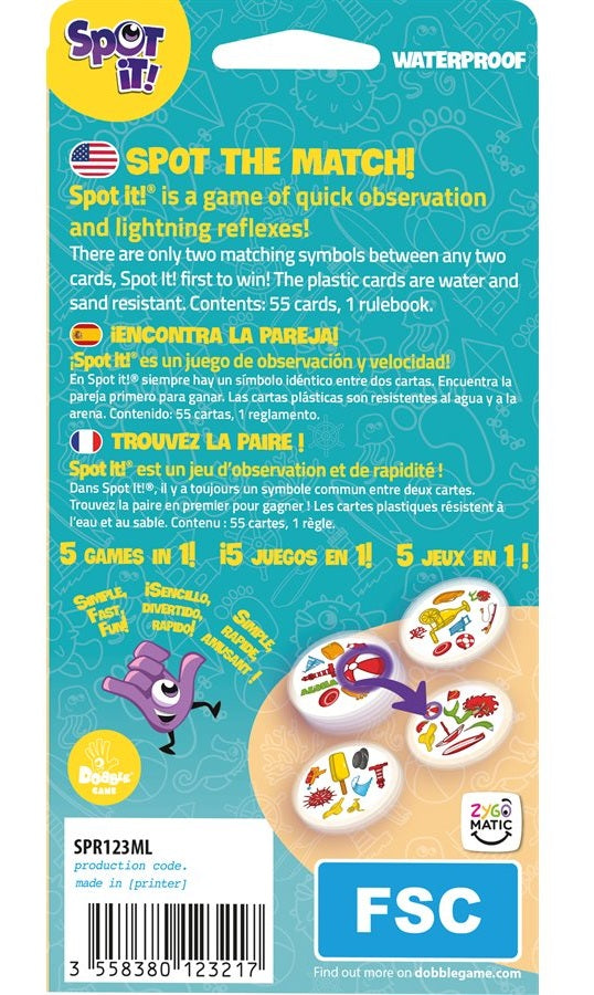 Testez votre sens de l’observation et votre rapidité avec le jeu maintes fois primé : Spot It! Beach, un jeu de choix éclairés en un éclair. Avec une douzaine de prix à son actif, en plus de multiples modes de jeux inclus dans la boite, Spot It! est un phénomène mondial!