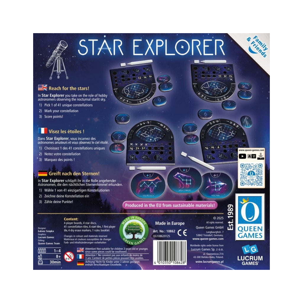 Star Explorer est une version internationale de Night Sky Explorers , un jeu sorti en 2024 par Lucrum Games uniquement en version polonaise et en édition limitée en anglais, exclusivement pour Essen 2024. Après avoir été épuisé en deux jours, il a été repris par Queen Games pour une sortie internationale en 2025. Star Explorer présente des illustrations et des composants mis à jour, mais en termes de gameplay, les deux versions sont exactement les mêmes.