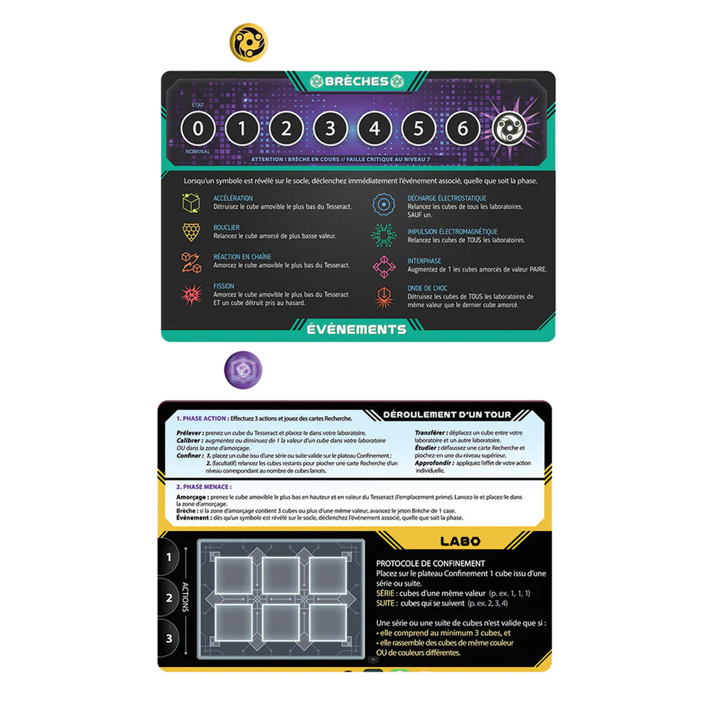 Actions stratégiques : Chaque tour, les joueurs disposent de trois actions pour manipuler les dés, les retirer du Tesseract, ajuster leurs valeurs, les transférer entre laboratoires et les isoler dans la matrice de confinement, ce qui nécessite un haut niveau de coordination entre les joueurs.