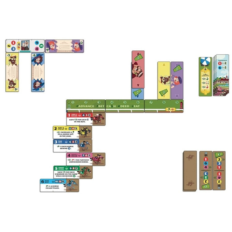 Le jeu se termine immédiatement après qu’un troisième cheval ait franchi la ligne d’arrivée (espace piste 9). Les joueurs révèlent ensuite leurs mises de départ et les multiplient par les cotes des 3 chevaux terminés. Ensuite, faites de même pour tous les paris placés sur la carte Bookie et ajoutez l’argent restant pour obtenir un total final. Le joueur avec le plus d’argent gagne !